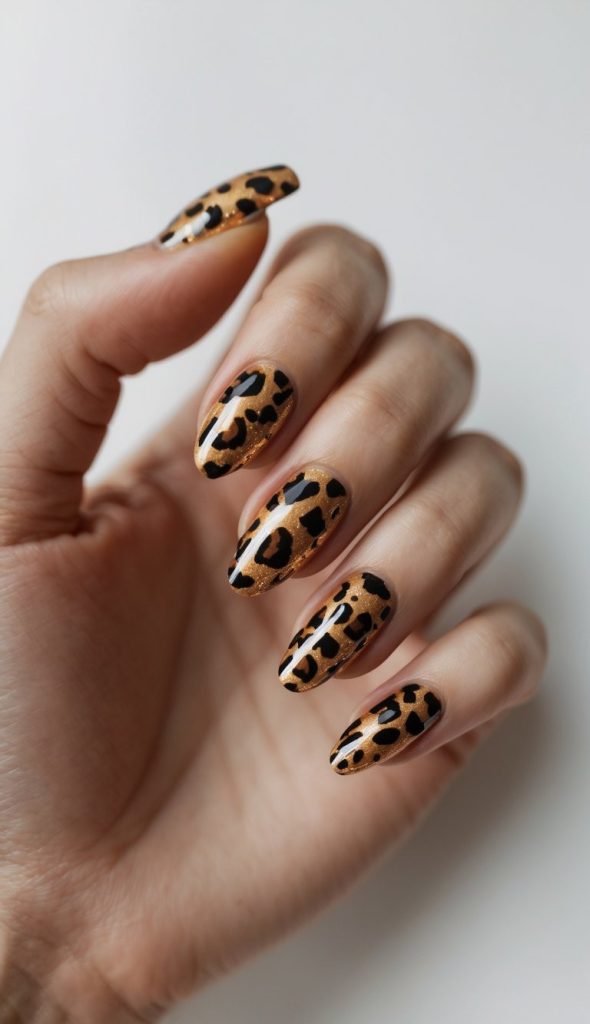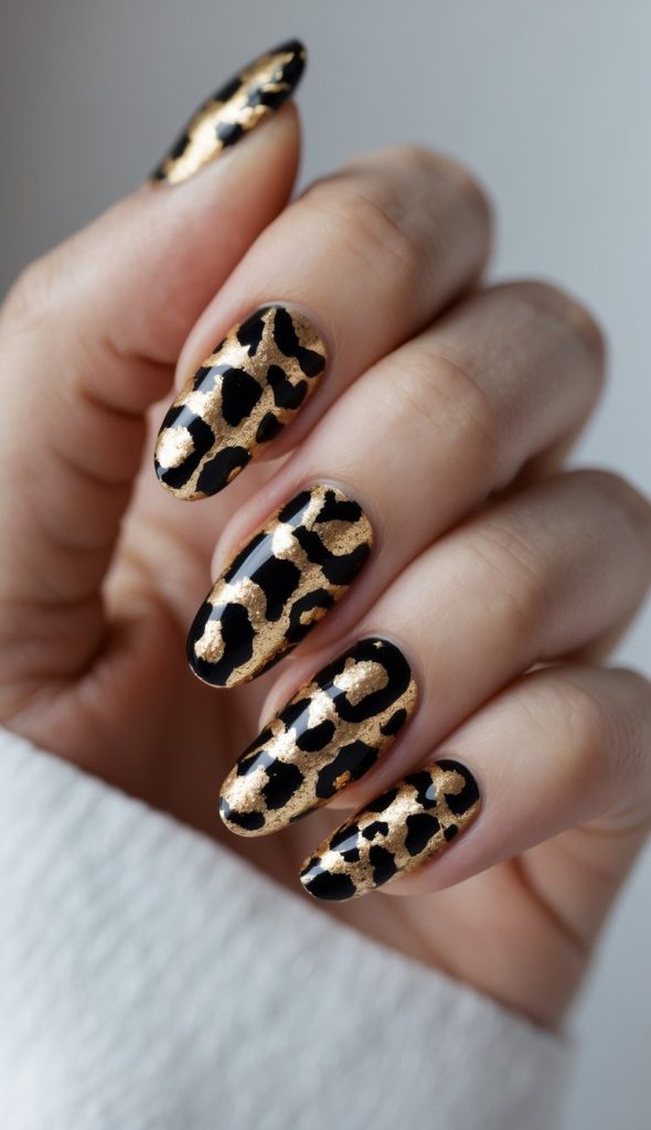Shimmering gold nails topped with bold black leopard spots create a glamorous animal print look. This sparkling design feels fierce, stylish, and perfect for adding a luxe touch to your manicure.