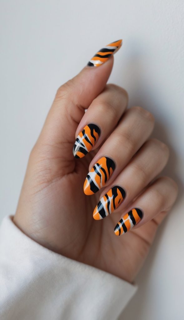 Bold orange, black, and white tiger-inspired swirls create a dynamic, eye-catching manicure. The flowing pattern adds movement and energy, making this animal print design feel modern and fierce.