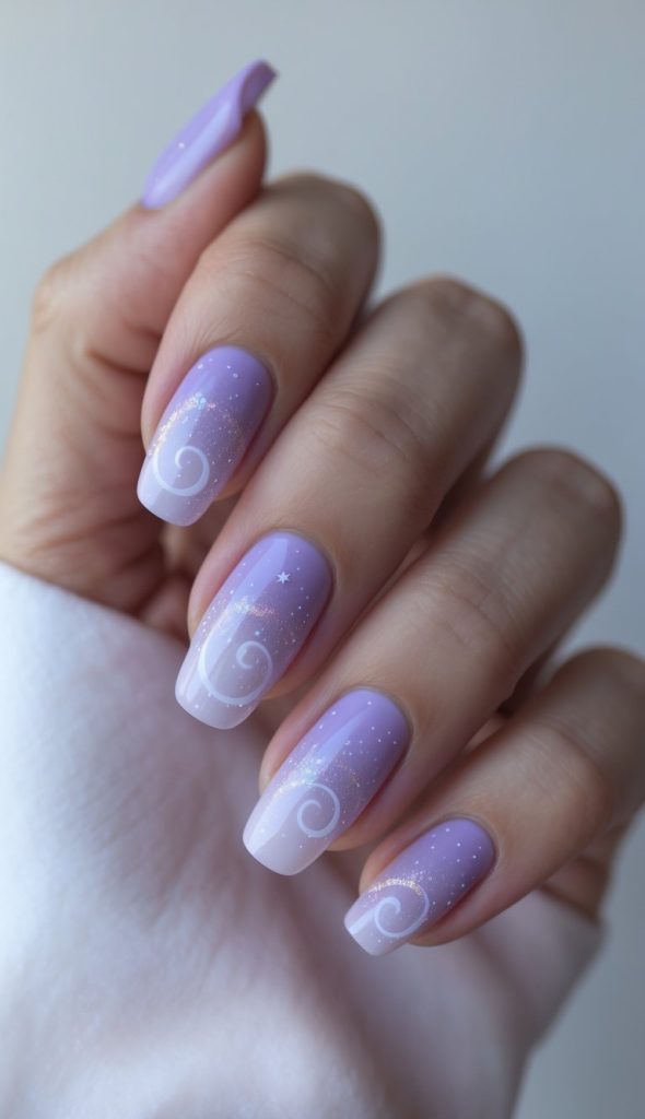 Soft lavender fades into a delicate glow, sprinkled with tiny stars for a dreamy galaxy effect. The gentle swirls add movement, giving your manicure a light, celestial charm.