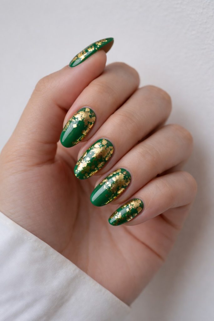Rich green nails sparkle with scattered gold foil that catches the light beautifully. Want Mardi Gras nail art ideas that feel bold yet elegant? This luxe design instantly brings festive shine.