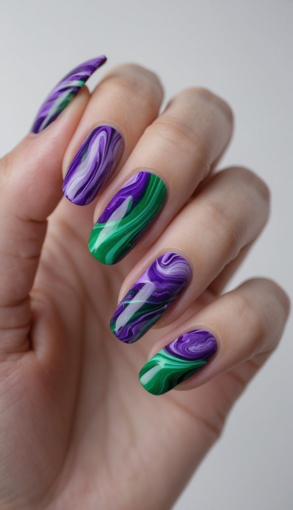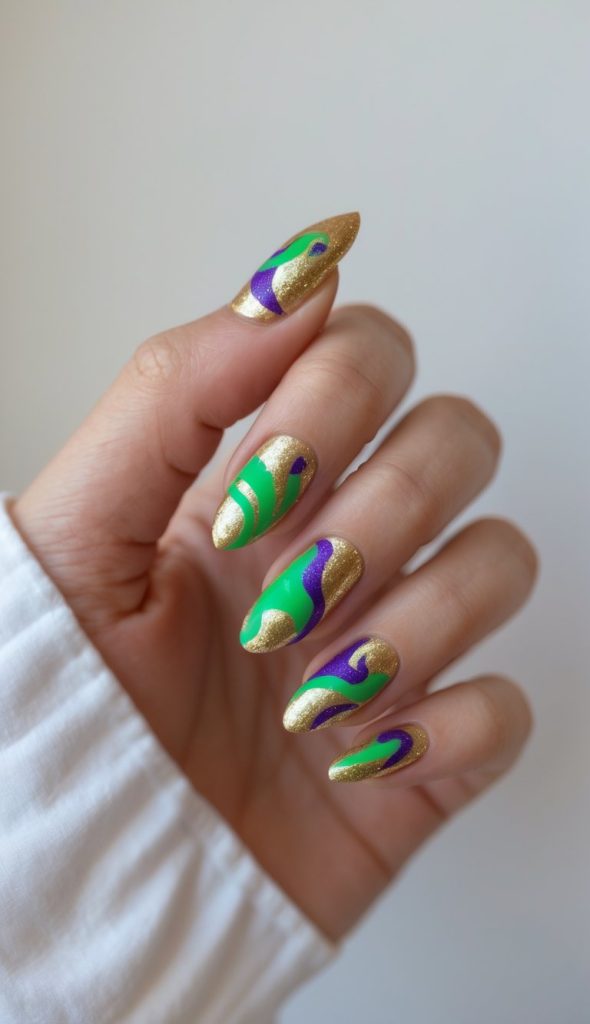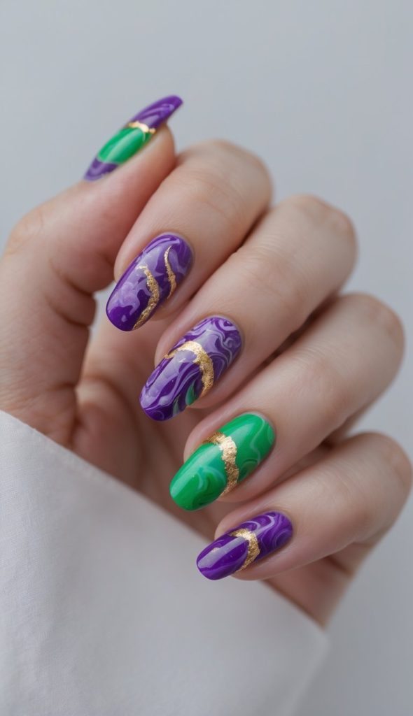 Swirling purple and green patterns flow across each nail like colorful marble. Want Mardi Gras nail art ideas that feel bold and artistic? This design brings festive color with a smooth, eye-catching twist.