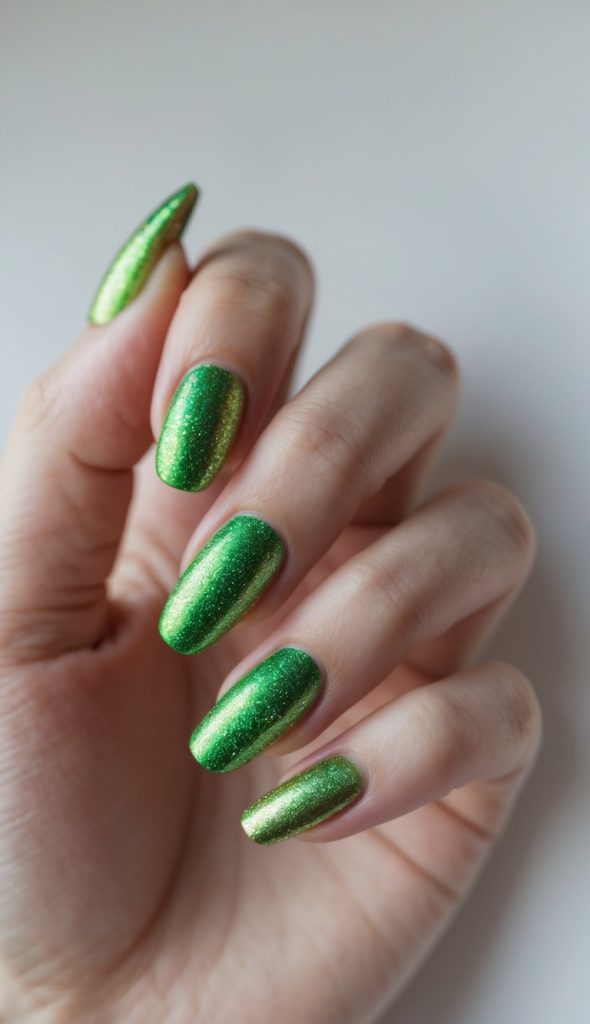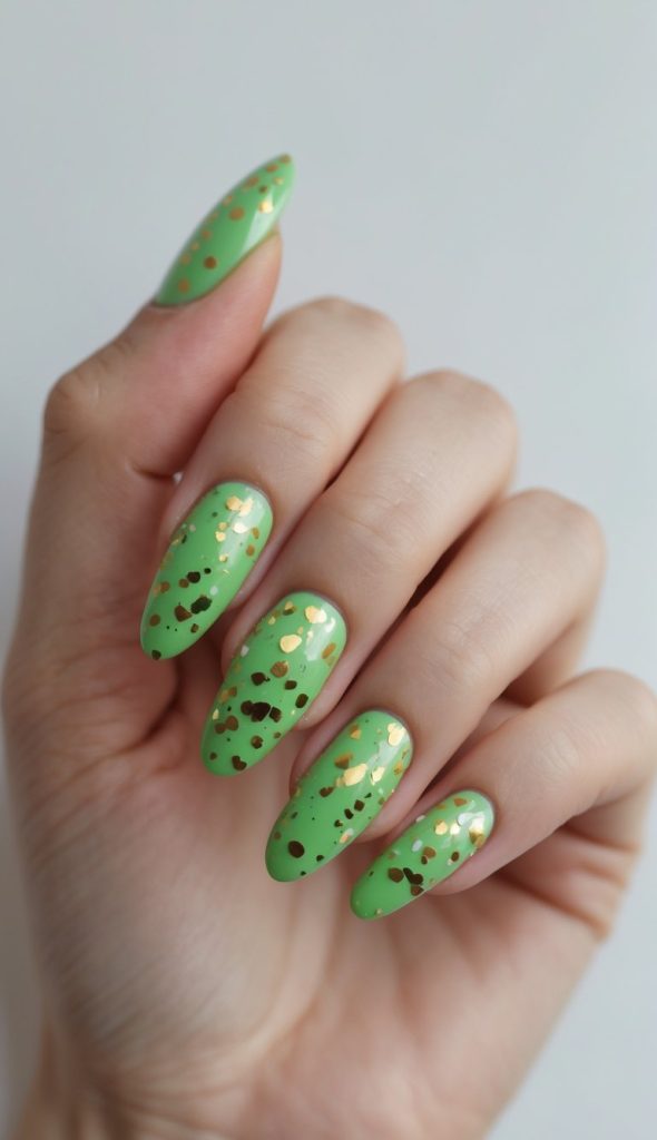 Playful gold flecks scatter across vibrant green nails like festive confetti in the air. Want something simple yet celebratory? This sparkling design brings instant Mardi Gras party vibes to your fingertips.