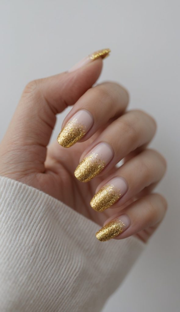 Shimmering gold glitter fades beautifully over soft nude nails for a glamorous Mardi Gras nail art look. Want something simple yet eye-catching? This sparkling gradient adds instant celebration-ready shine.