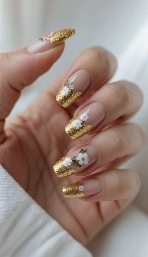 Delicate white flowers bloom over nude nails with shimmering gold tips for a soft Mardi Gras–inspired look. Want something festive but feminine? This design blends sparkle and floral charm beautifully.