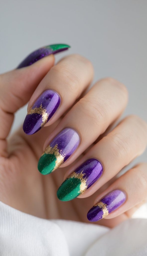 Bold purple tips meet vibrant green polish, separated by sparkling gold stripes that instantly feel festive. Want nails that capture the Mardi Gras spirit? This colorful combo brings celebration right to your fingertips.