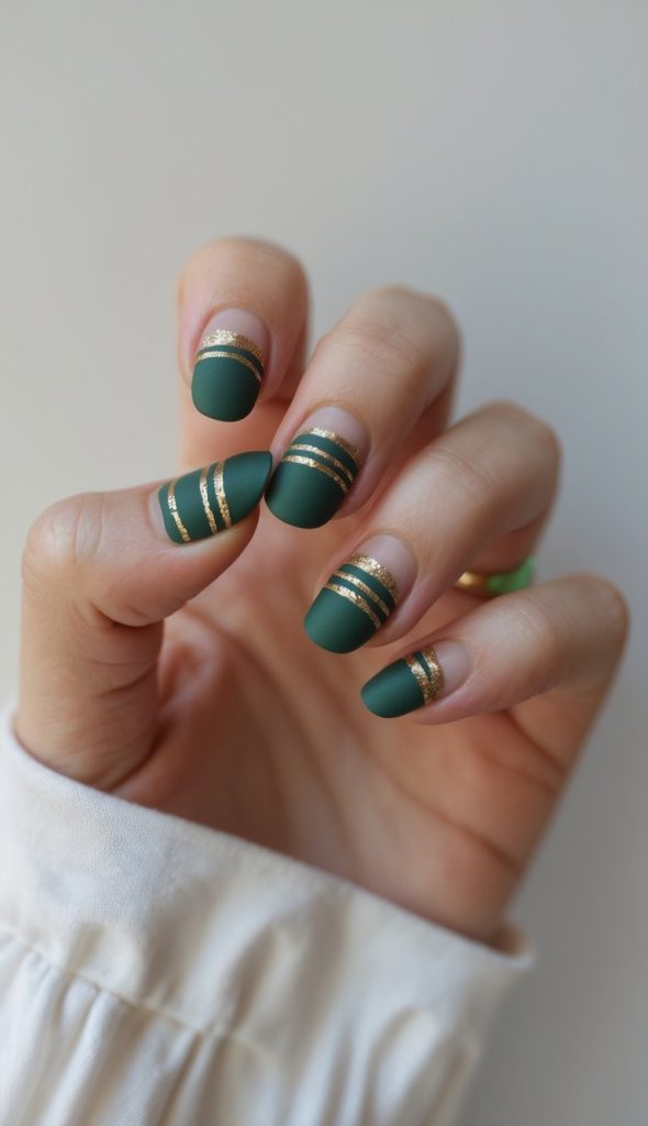 Matte green nails paired with sleek gold stripes create a chic take on Mardi Gras nail art ideas. Looking for something festive but refined? This design balances bold color with elegant metallic detail.