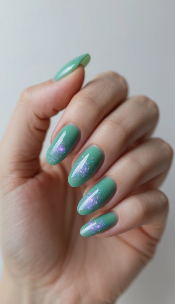 Soft mint-green nails shimmer with delicate purple sparkle that catches the light beautifully. Want a subtle Mardi Gras vibe? This dreamy glitter glow adds festive color while keeping your manicure elegant.