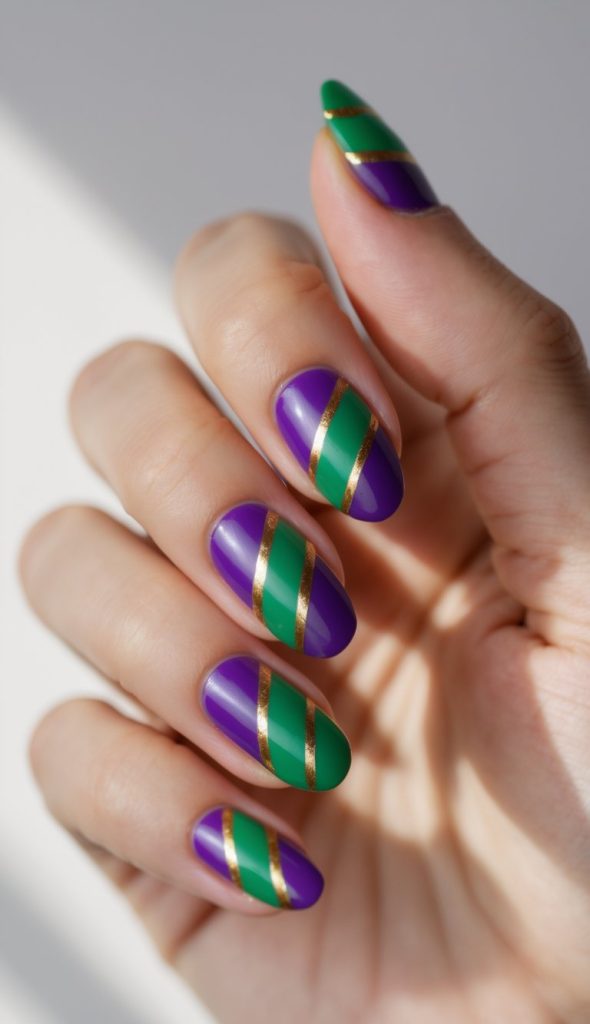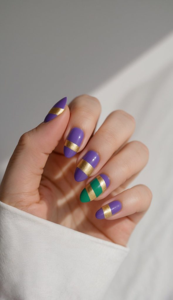 Rich purple nails shine with bold gold bands, while a pop of green adds classic Mardi Gras flair. Want something festive yet simple? This striped design keeps your manicure stylish and celebration-ready.