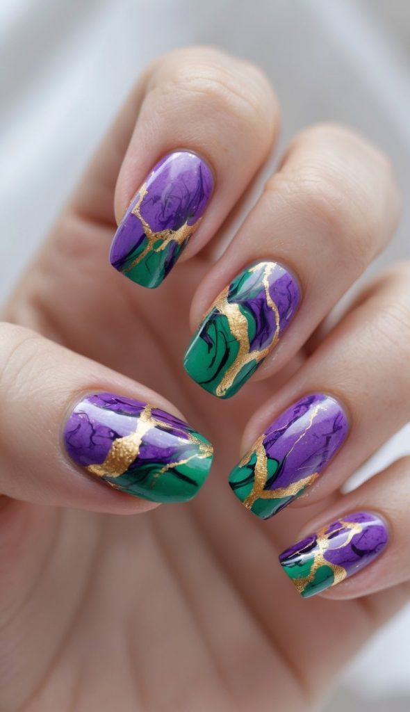 Swirls of purple and green blend beautifully with striking gold veins for a luxurious Mardi Gras-inspired manicure. Looking for something artistic and bold? This marble design instantly makes your nails feel festive and elegant.