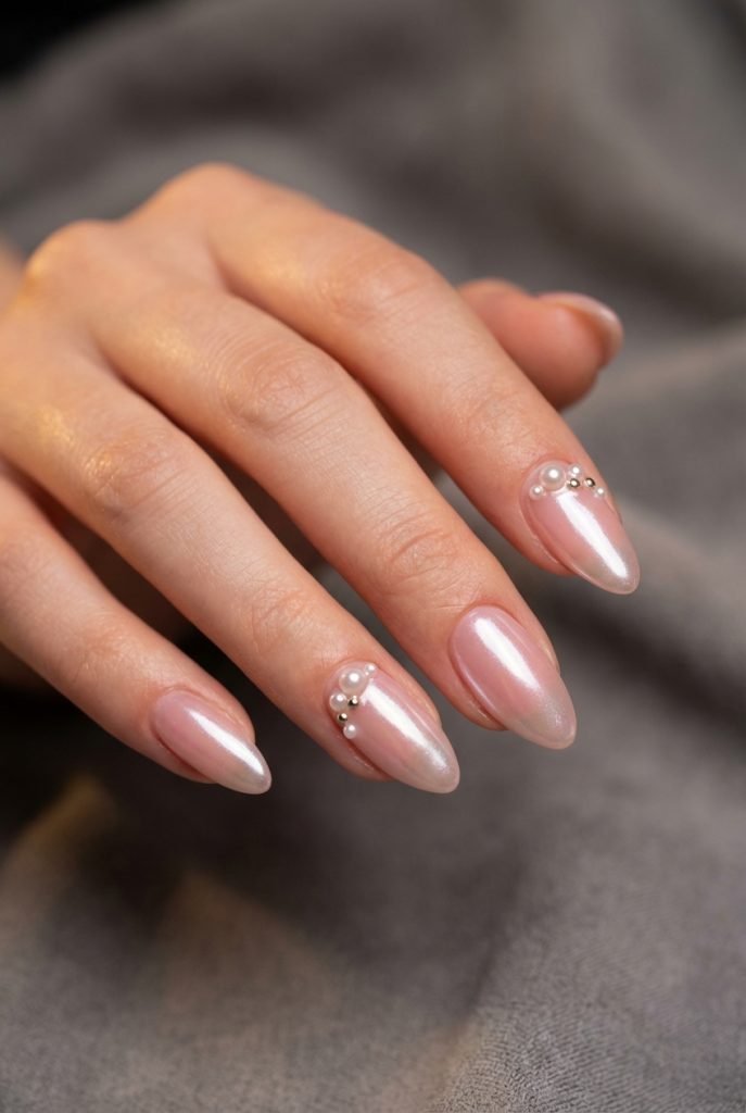 Hand with almond-shaped nails in shimmering baby pink, showcasing a pearl nail art idea where single small pearls are placed on a few nails for an elegant accent.
