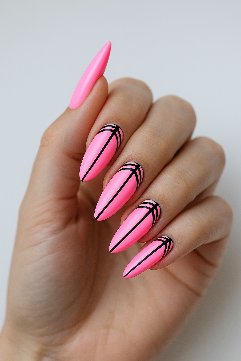 Serving serious 80s energy, these hot pink nails with bold black linework are pure electric nostalgia. They’re sharp, graphic, and totally made for your inner pop diva.