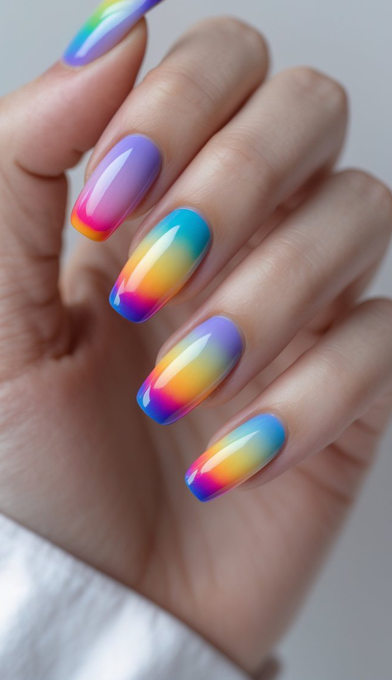 A dreamy ombre rainbow sweeps across every nail, blending purple, blue, yellow, and pink just like those iconic ’80s windbreakers. Show off your love for all things colorful and nostalgic with this mani!