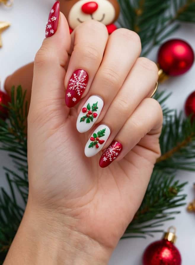 This design showcases red and white nails adorned with snowflakes, a Christmas tree, and holiday patterns. The mix of festive symbols creates a joyful holiday look.