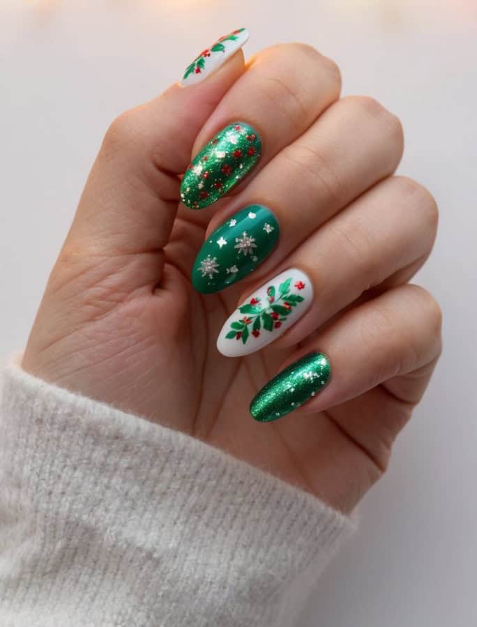 Green and white nails feature intricate snowflakes, delicate holly leaves, and golden embellishments, creating a festive and polished winter look.