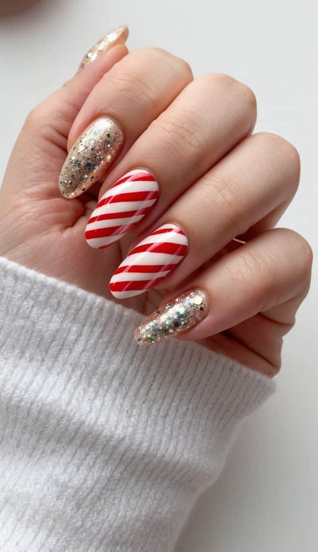 Bold red-and-white candy cane stripes pair beautifully with gold glitter nails for a festive, eye-catching look. This sweet and shimmering design is perfect for the holiday season.