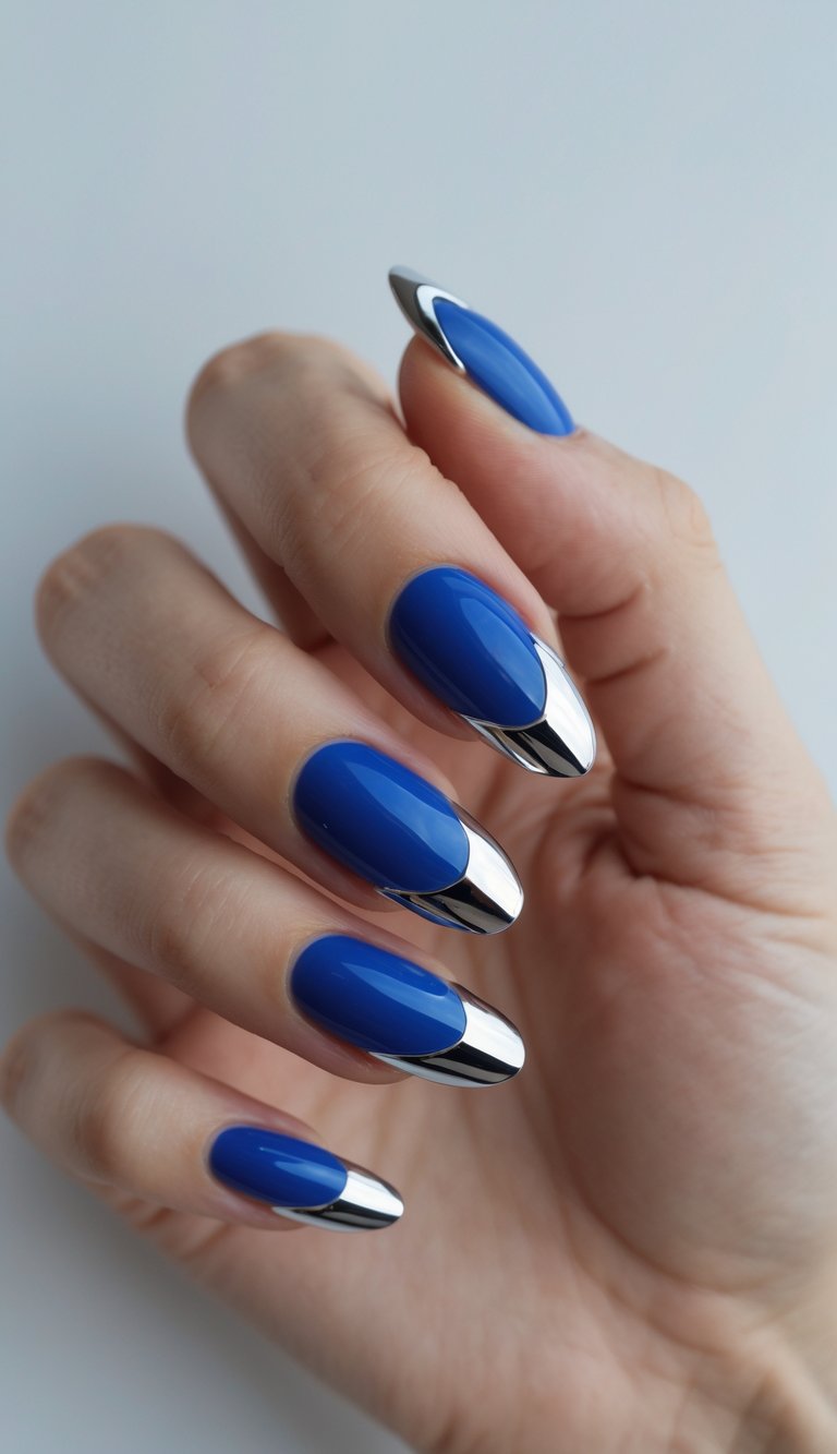 Sleek and modern, this cobalt manicure pairs glossy polish with mirror-like silver chrome tips for a bold finish. You’ll love how it instantly sharpens your overall look.