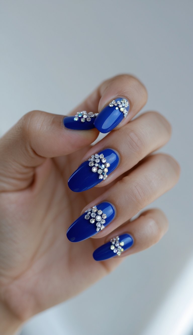 Add a touch of sparkle with clustered rhinestones set against a rich cobalt base. This design lets you turn everyday nails into something dazzling.