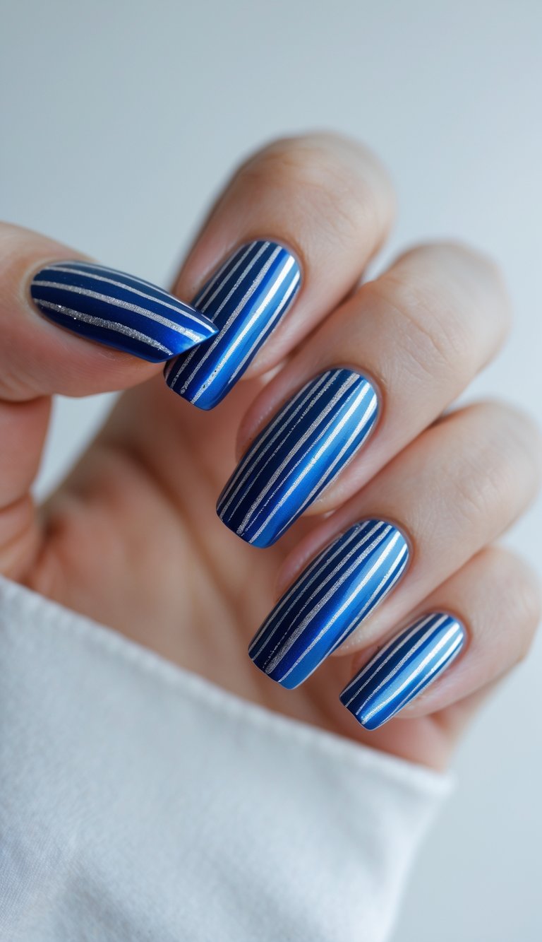 Bold silver glitter stripes stretch across a glossy cobalt base, giving your nails a graphic, high-impact vibe. Perfect for making a statement at any event!