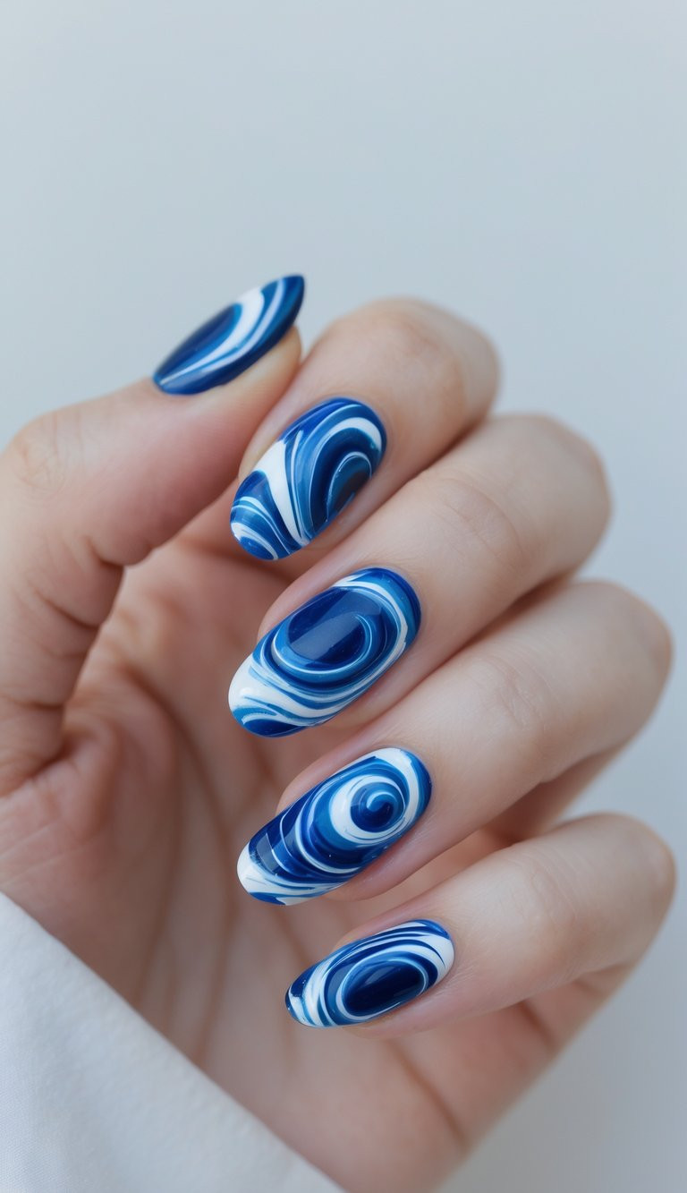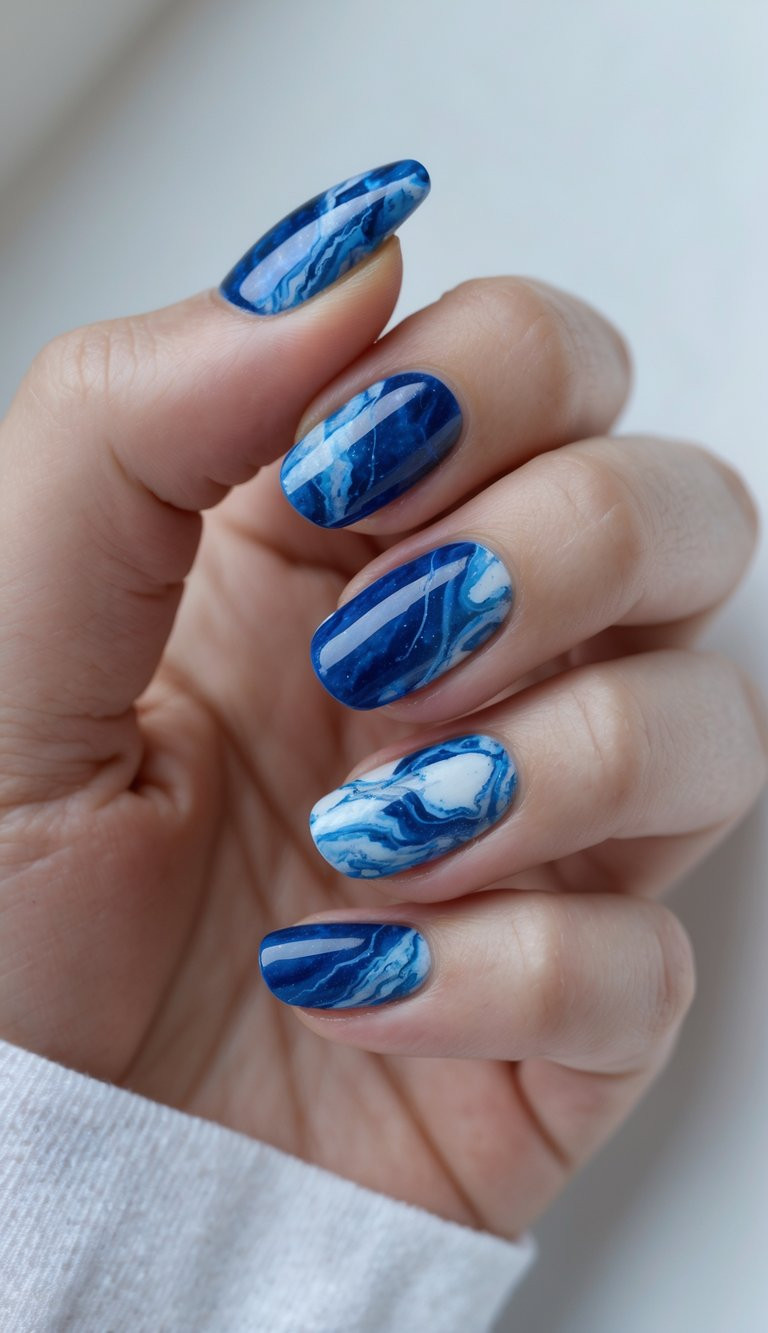 Cobalt Blue Marble Swirl Nails