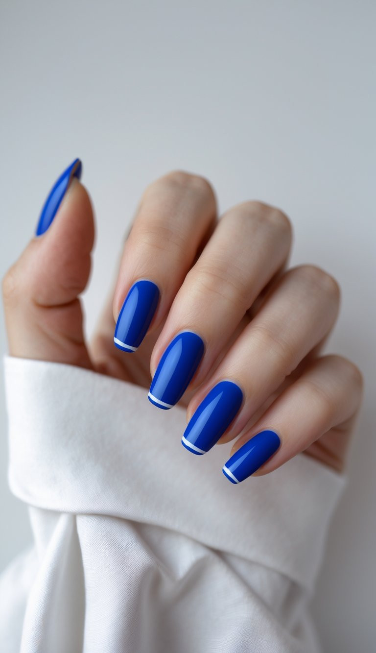 Classic with a crisp twist. Glossy cobalt nails are finished with ultra-thin white tips, creating a clean, minimal look that feels effortlessly chic and modern.
