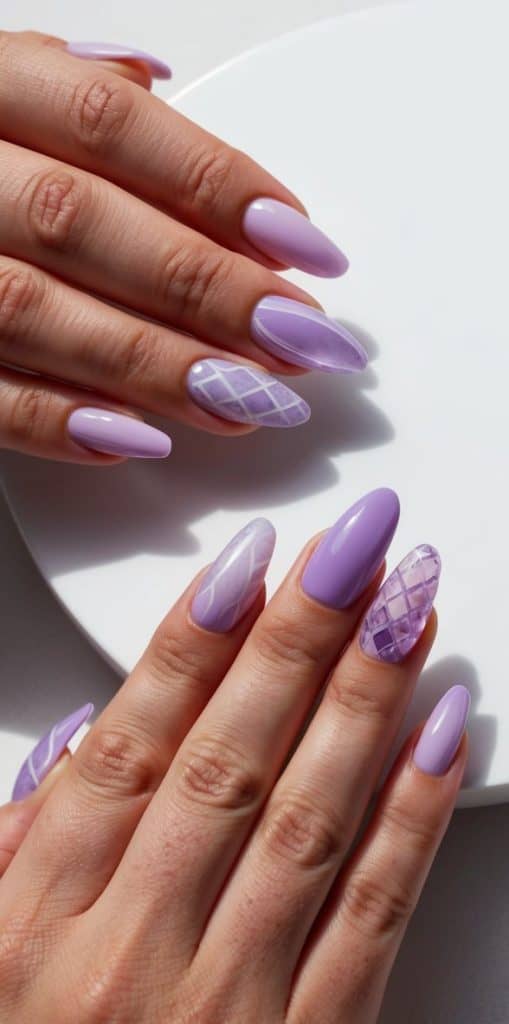 Create a dreamy ombre effect by blending soft lavender hues from light to dark across your nails for a ethereal, feminine look. You can contrast it with an accent nail featuring a white grid design.