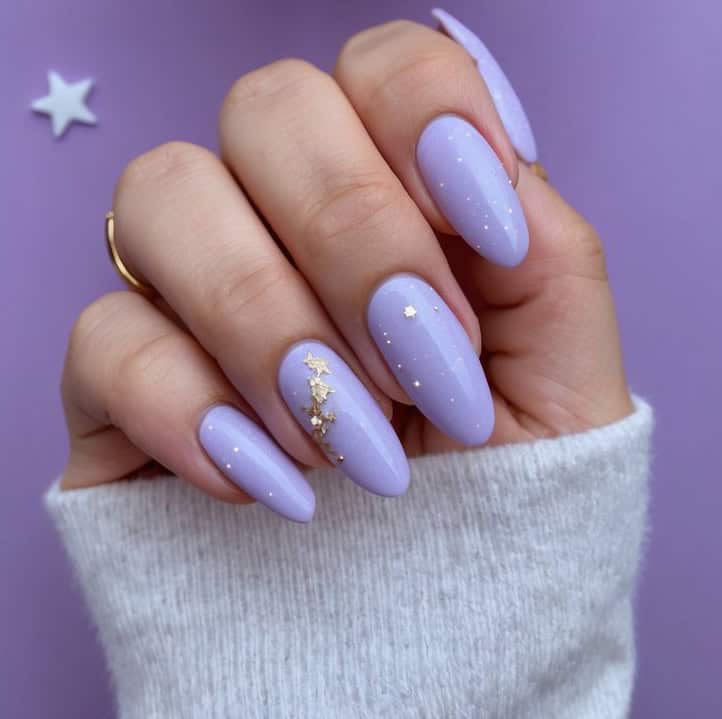 This dreamy lavender manicure features tiny gold stars and subtle speckles for a cosmic touch.