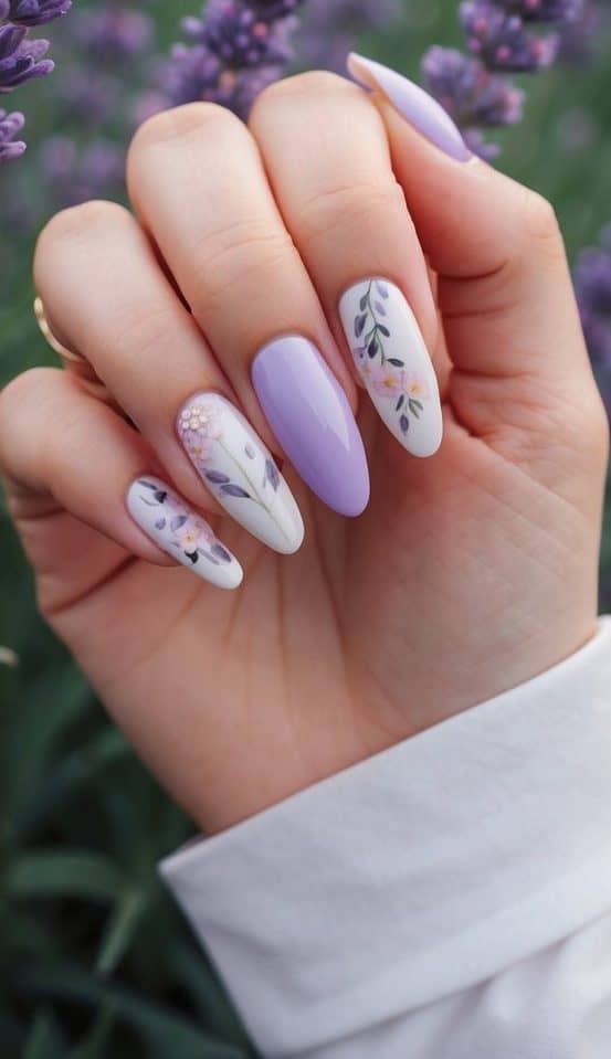 This chic lavender nail design features a mix of solid pastel, delicate white stripes, and intricate leaf and floral accents. Its soft hues and delicate charm gives your nails a spring-ready look.