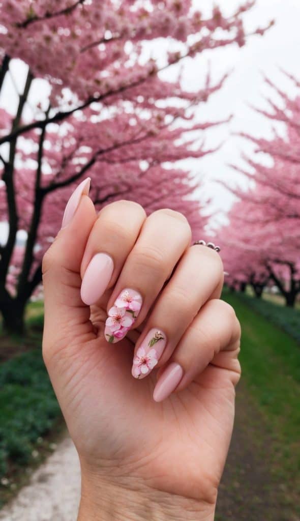Delicate blush pink nails are paired with a single gold foil accent, creating a subtle yet luxurious minimalist design that’s perfect for adding a touch of effortless elegance to a modern look.