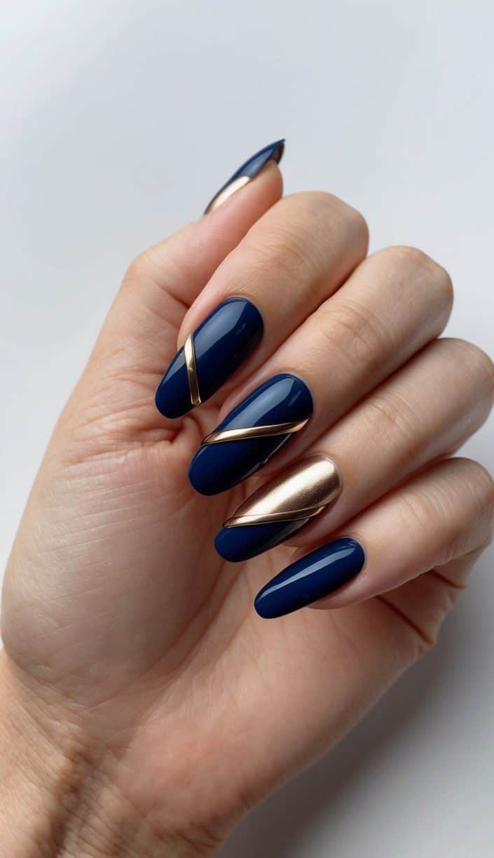 Navy blue nails shine with gorgeous metallic foil accents that catch the light beautifully as you move your hands.