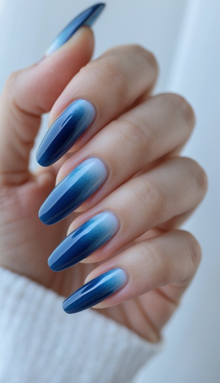 Dreamy and dimensional, this navy-to-blue ombre fades beautifully with a subtle sparkle. Want a celestial vibe? These nails give you that soft, starry-night glow effortlessly.