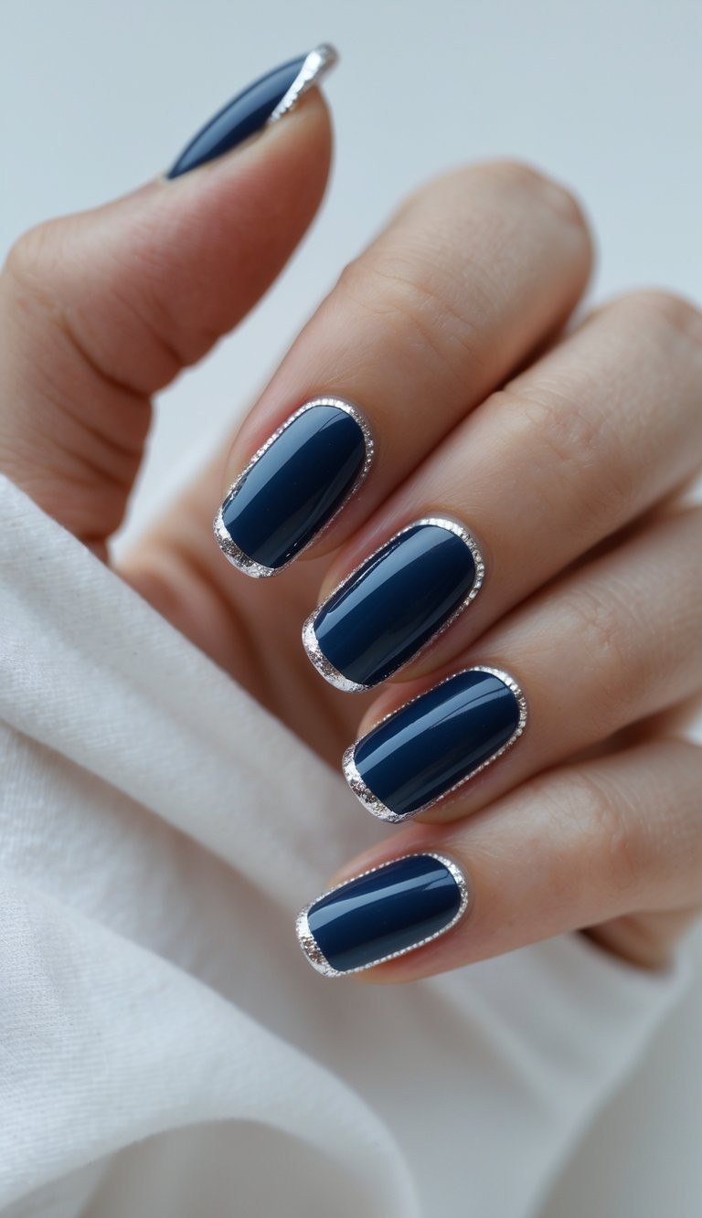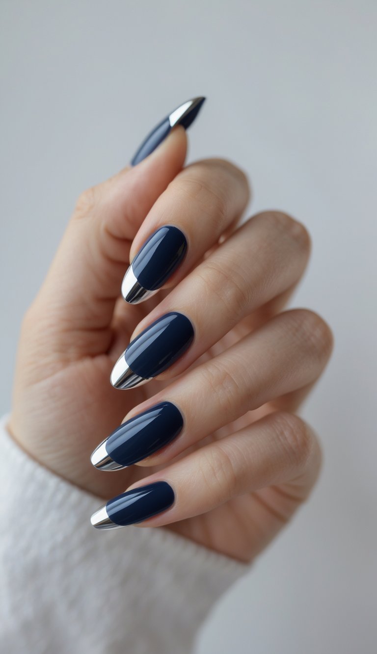Sleek chrome tips elevate the glossy navy base, giving your manicure a sharp, contemporary edge. Go for this look when you want something bold yet sophisticated.