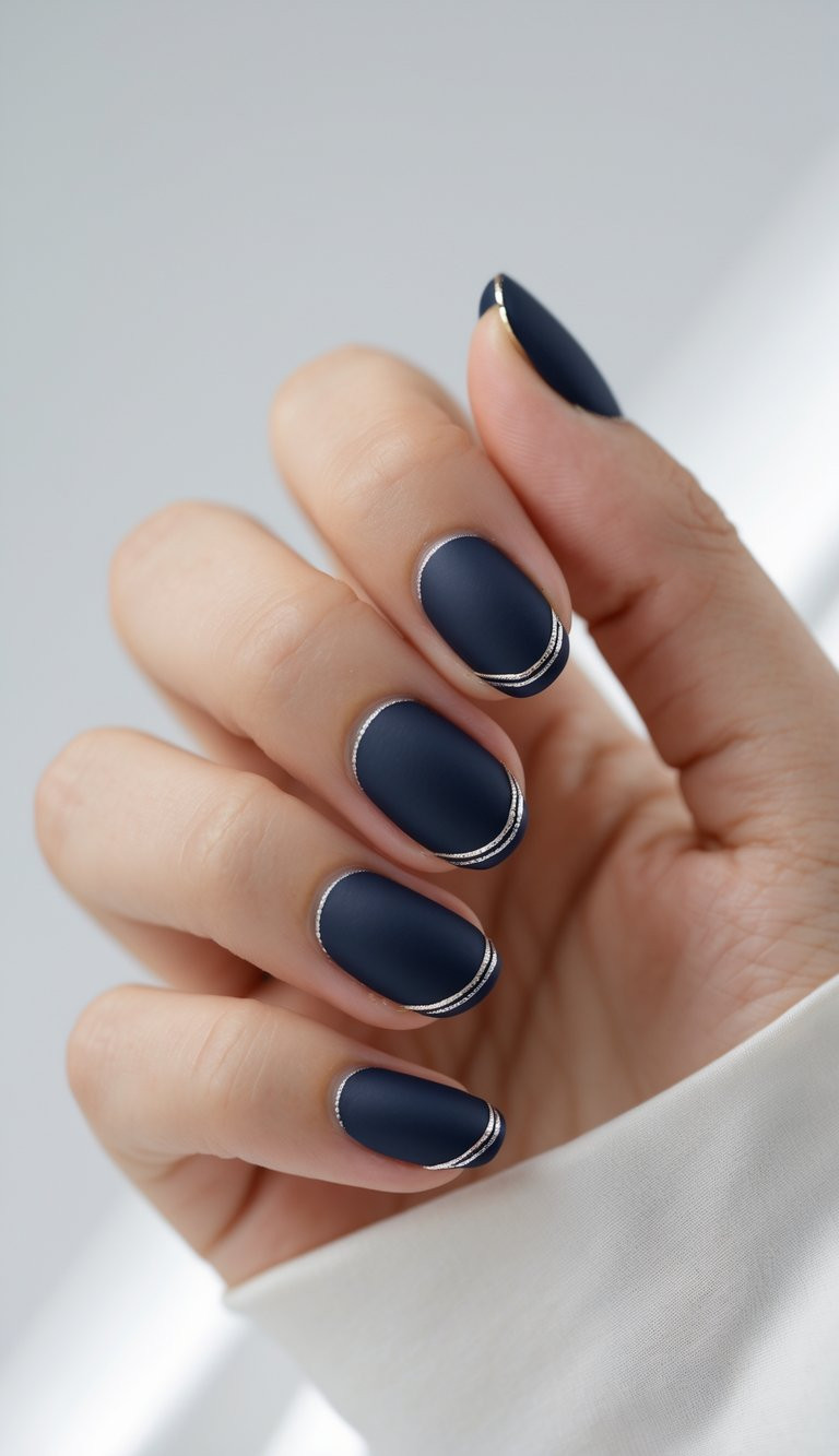 Subtle yet striking, these fine silver curves elevate a matte navy base beautifully. Looking for a modern twist on French tips? This design feels clean, artistic, and effortlessly chic.