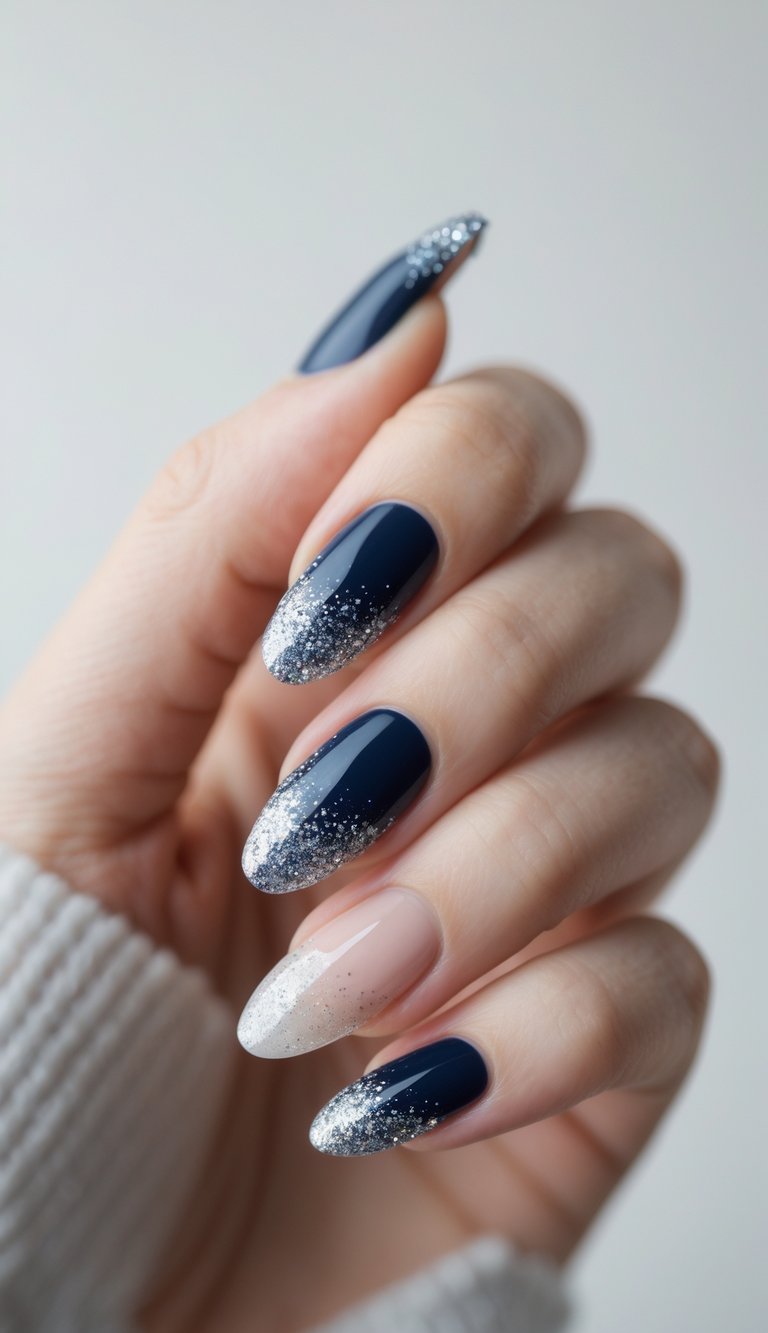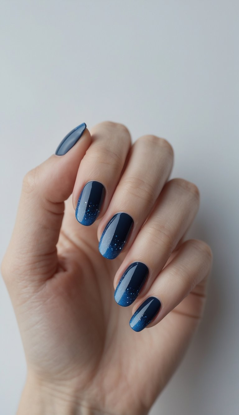 Navy blue nails sparkle beautifully when topped with a glitter gradient that fades from tip to base, creating a starry night sky effect on your fingertips.