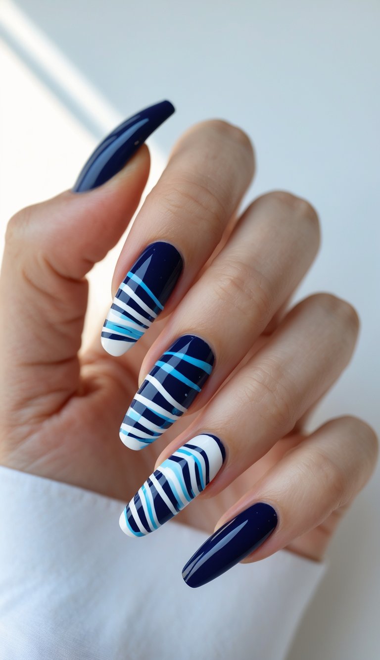 Flowing across each nail, layered stripes in navy, white, and aqua create a dynamic, ocean-inspired look on a navy blue base. You’ll love how the mix of lines adds movement and depth.