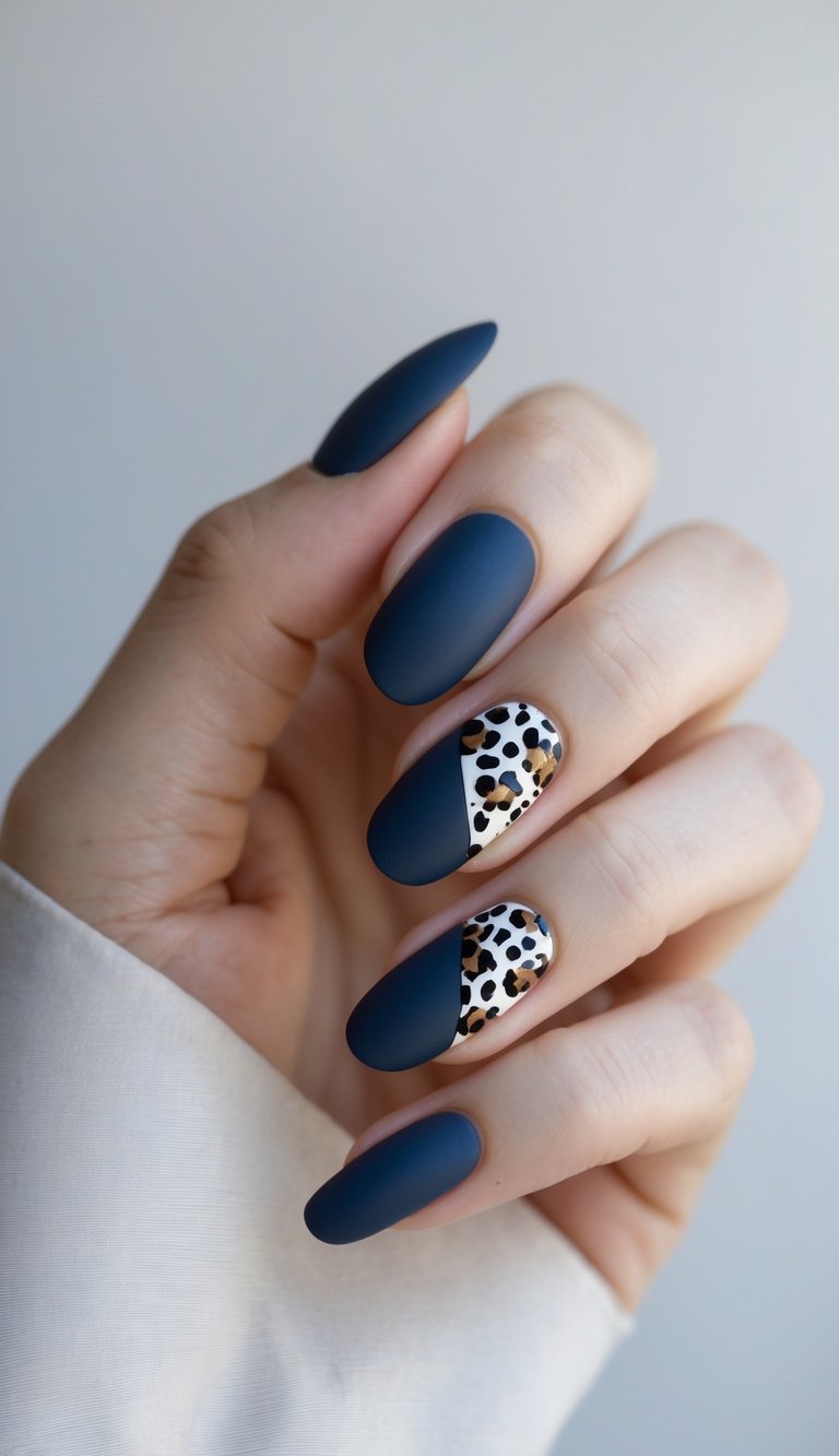 Bold navy polish gets a playful twist with leopard accents that instantly catch the eye. Feeling adventurous? This mix of classic and wild adds personality without overwhelming your look.