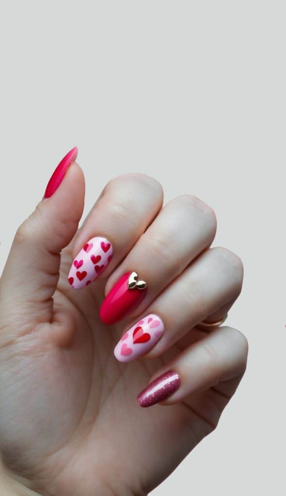 These pink nails create a dreamy Valentine’s Day look. Each nail boasts a different shade of pink, with a glittery accent nail featuring a gold heart charm, creating a delicate yet romantic style.