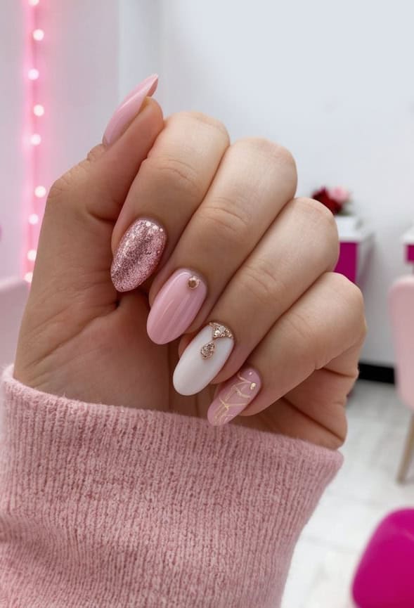 Subtle yet glamorous, this design is ideal for a sophisticated celebration. It combines glittery pink, glossy pastels, and delicate gold details for a chic Valentine’s manicure.