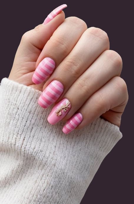 Add a playful pop to your Valentine’s Day mani with pink stripes! These fun, feminine lines bring a unique element to your nails while keeping things sweet and romantic, especially with a solid pink accent nail featuring a gold accent.