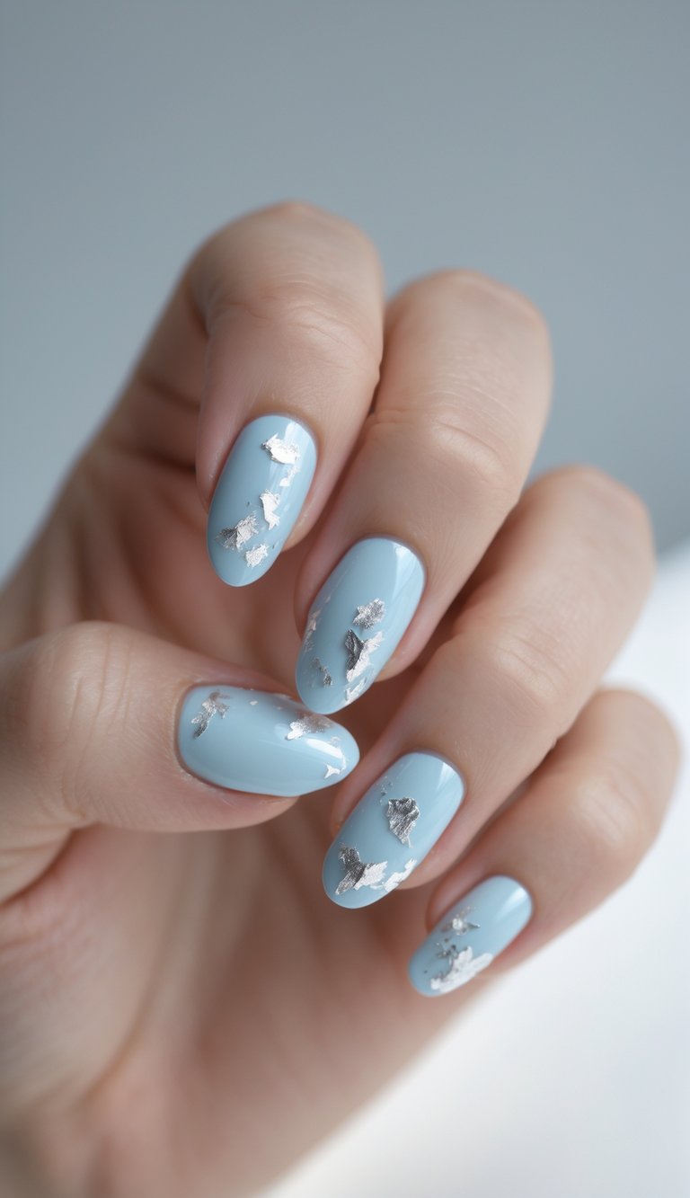 A soft powder blue base meets scattered silver foil accents for a delicate, light-catching finish that feels effortlessly chic. The subtle shimmer adds just enough edge without overpowering the calm color.