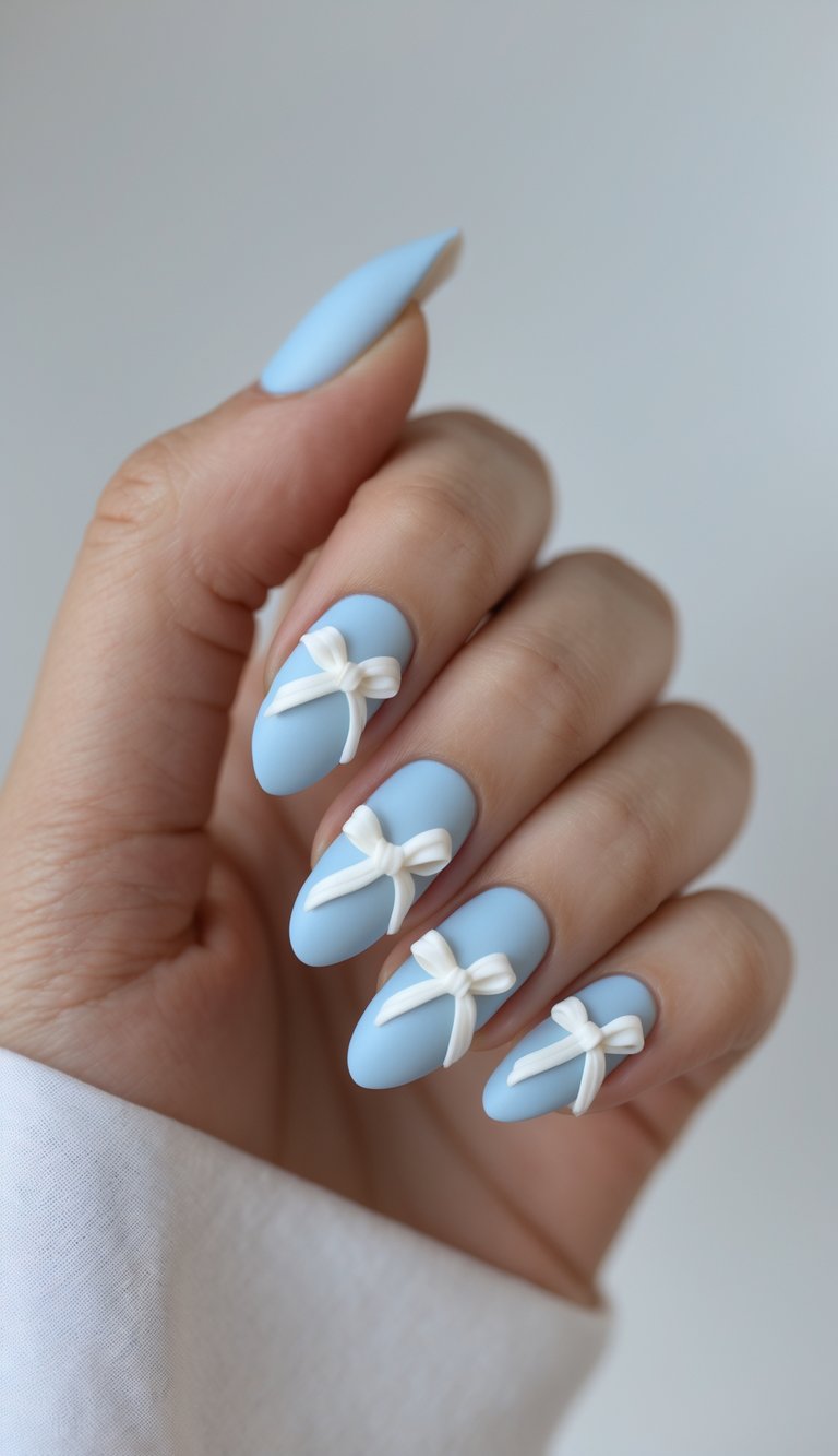 Adding 3D white bows to matte powder blue nails brings a sweet yet dynamic look to your manicure. It’s a playful yet polished look you’ll love showing off.