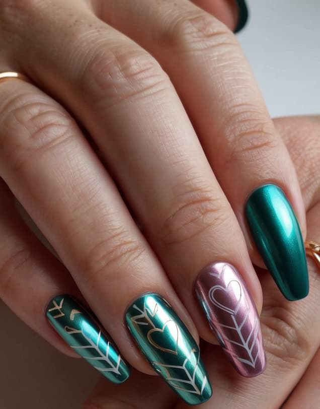 This dazzling manicure features a mesmerizing blend of gold, teal, and purple chrome with a mirror-like finish. The shifting metallic hues create a bold, futuristic look perfect for prom night.