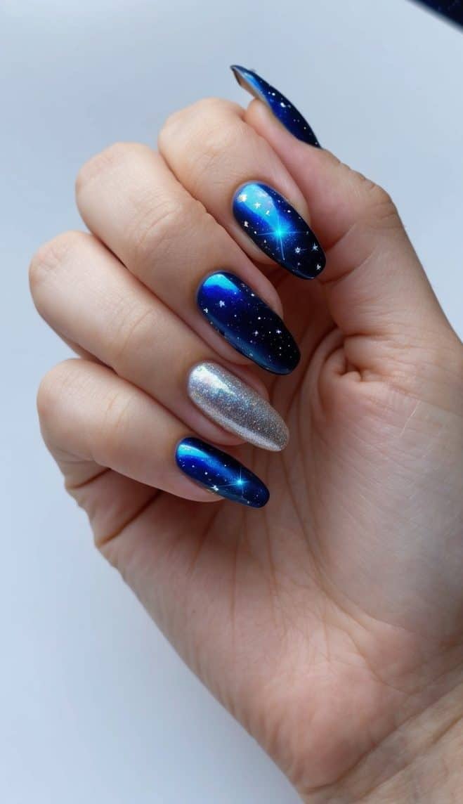 Twinkling star designs and silver glitter dance across nails in dreamy celestial designs, perfect for a magical prom night under the stars.