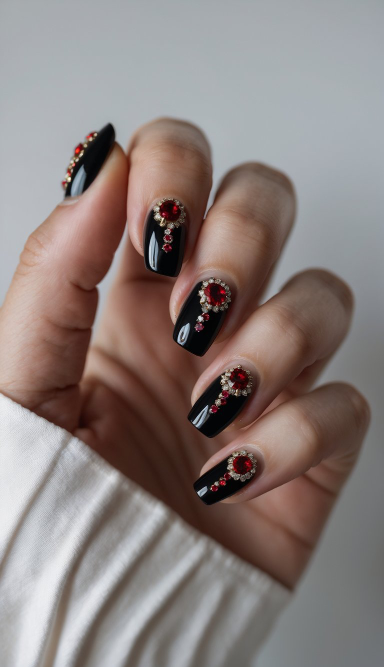 Black nails with red rhinestones add a bold sparkle that feels both glamorous and fun. This look makes a dazzling statement, perfect for a classy look with just the right amount of edge.