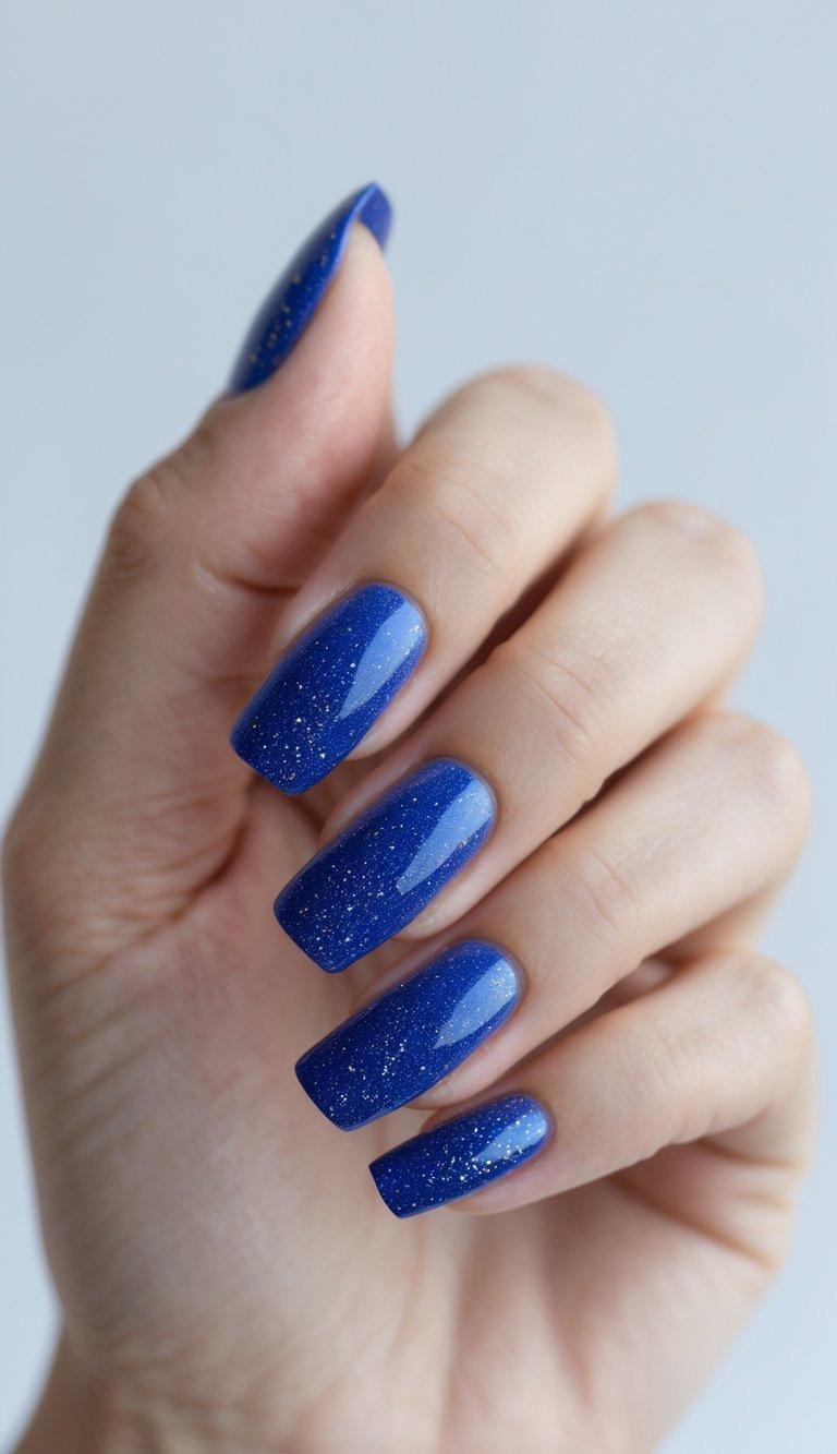 If you want something luxe, these scattered gold flakes over royal blue elevate your manicure with an artistic, high-end finish.