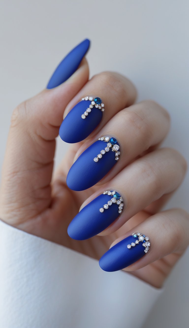 Add subtle glamor to your look with matte royal blue nails topped with delicate crystal accents. These make an elegant statement and catch the light without overwhelming the mani.