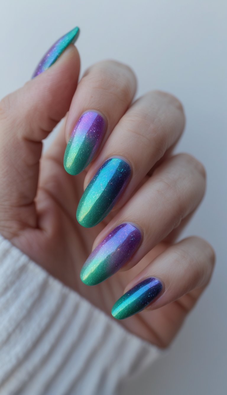 Rich hues of purple, teal, and blue blend seamlessly into a glowing gradient that mimics the Aurora Borealis. The added shimmer catches the light and makes your nails look dynamic.