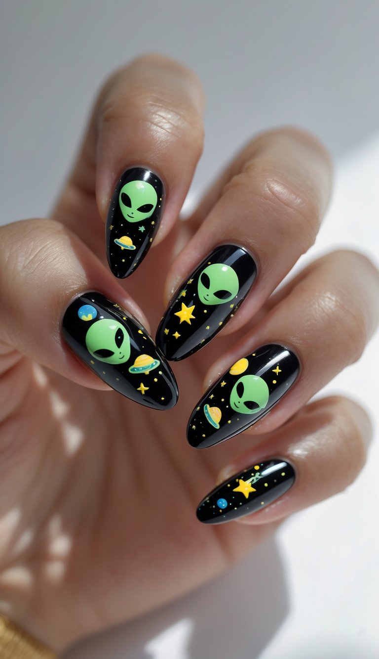 Bright green aliens and tiny planets pop against a glossy black base, instantly giving your nails a quirky, out-of-this-world vibe. It’s a playful design that adds personality without feeling over-the-top.