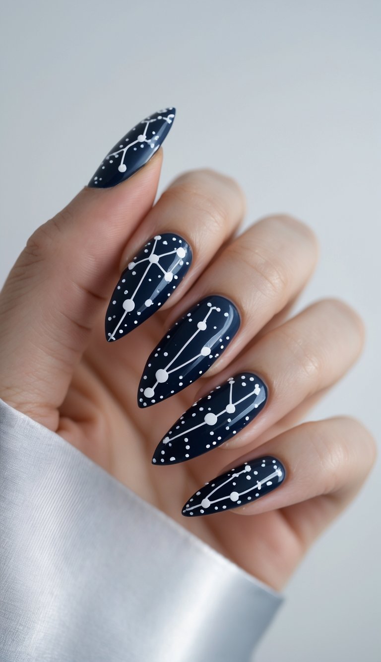 Here, deep navy polish sets the stage for fine white constellation patterns that stretch elegantly across each nail. This design brings a subtle cosmic feel that’s both refined and eye-catching.