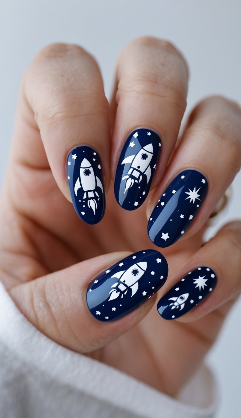 This manicure features tiny rockets drifting through a navy base with white stars, turning your manicure into a fun space-inspired scene. It’s a whimsical choice that still looks clean and polished.