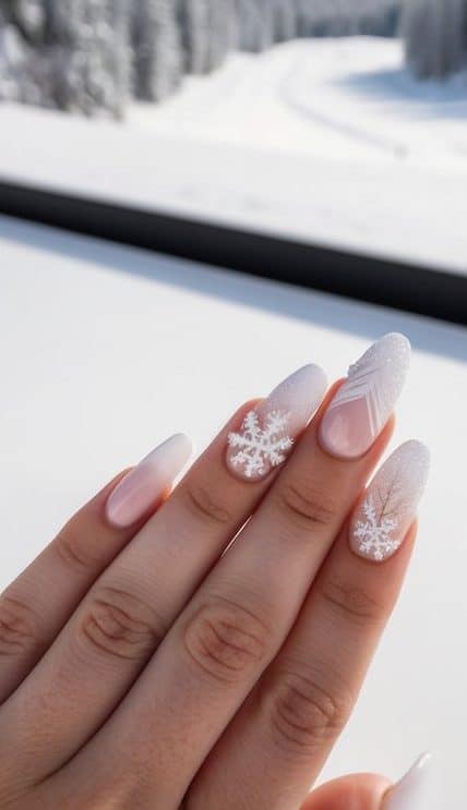 Pale pink nails showcase frosted textures, sparkling embellishments, and a dainty snowflake motif. This elegant design embodies the quiet beauty of a snowy winter’s day.
